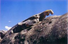 怪石山距巴里坤县城60公里,有10多公里的便道与县城至煤矿的柏油公路相接,位于巴里坤湖西北7公里外小夹山的最东端。怪石山最怪的就是满山的形状各异的小石窟,几座山从山顶到山脚都是“千疮百孔”,有的称“蜂窝崖”,有的称“千佛洞”或“万佛龛”、“千窟崖”等。每当下暴雨时水从山顶流下,那山便成了无数个小水帘洞,景致令人叫绝!怪石山下就有一眼泉水,是著名的巴里坤八景之一――“镜泉宿月”的上镜儿泉所在。此泉实为一水井,水量大,水质好。山顶上的石棺王爷坟说明了怪石山一带悠久的历史、繁荣的丝路商贸活动和极险要的军事地位,1999年它的旅游价值才被发现并随之开发。